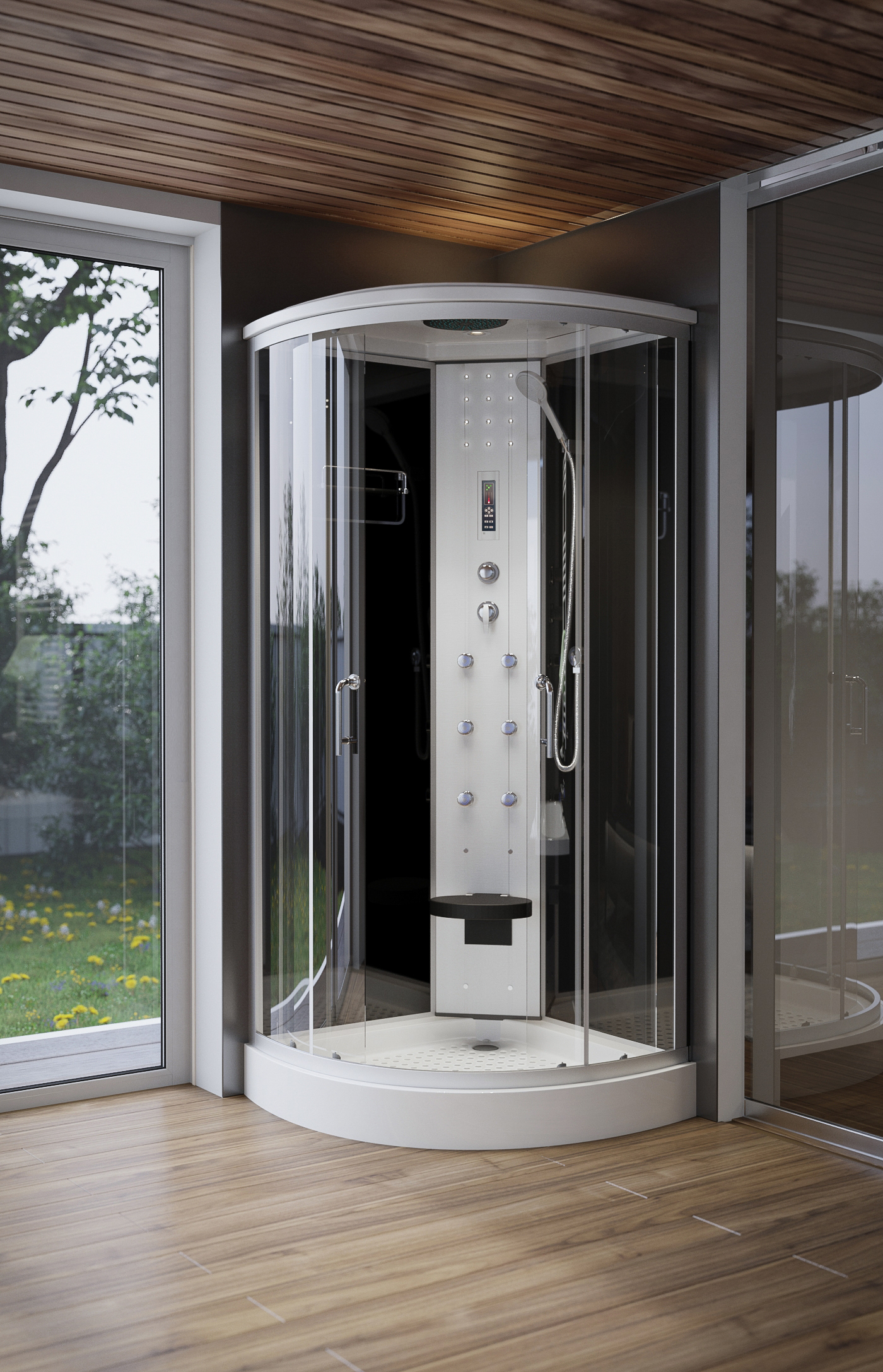 Negyedkörívés hidromasszázs zuhanykabin elektronikával 90x90x222cm Hagyományos alakú (R550) üvegszál erősítéses, acél merevítésű, fehér színű, alacsony, akril zuhanytálca, állítható fém lábakkal. Matt króm alumínium ívek és profilok. 5 mm víztiszta biztonsági üvegek és ajtók. Fekete színű üveg hátfalak. Matt króm funkciós panel. 6 db hidromasszázs fúvóka. Rádió. Felső világítás. LED háttérvilágítás. Ventilátor. Vezetékes telefon csatlakozási lehetőség. Kézi zuhany. Felső esőztető zuhany. Felhajtható ülőke. Kerámia betétes keverőszelep és funkció váltó. Piperepolc. Mágneses ajtózár. Görgős ajtónyitás. Leeresztő szelep.