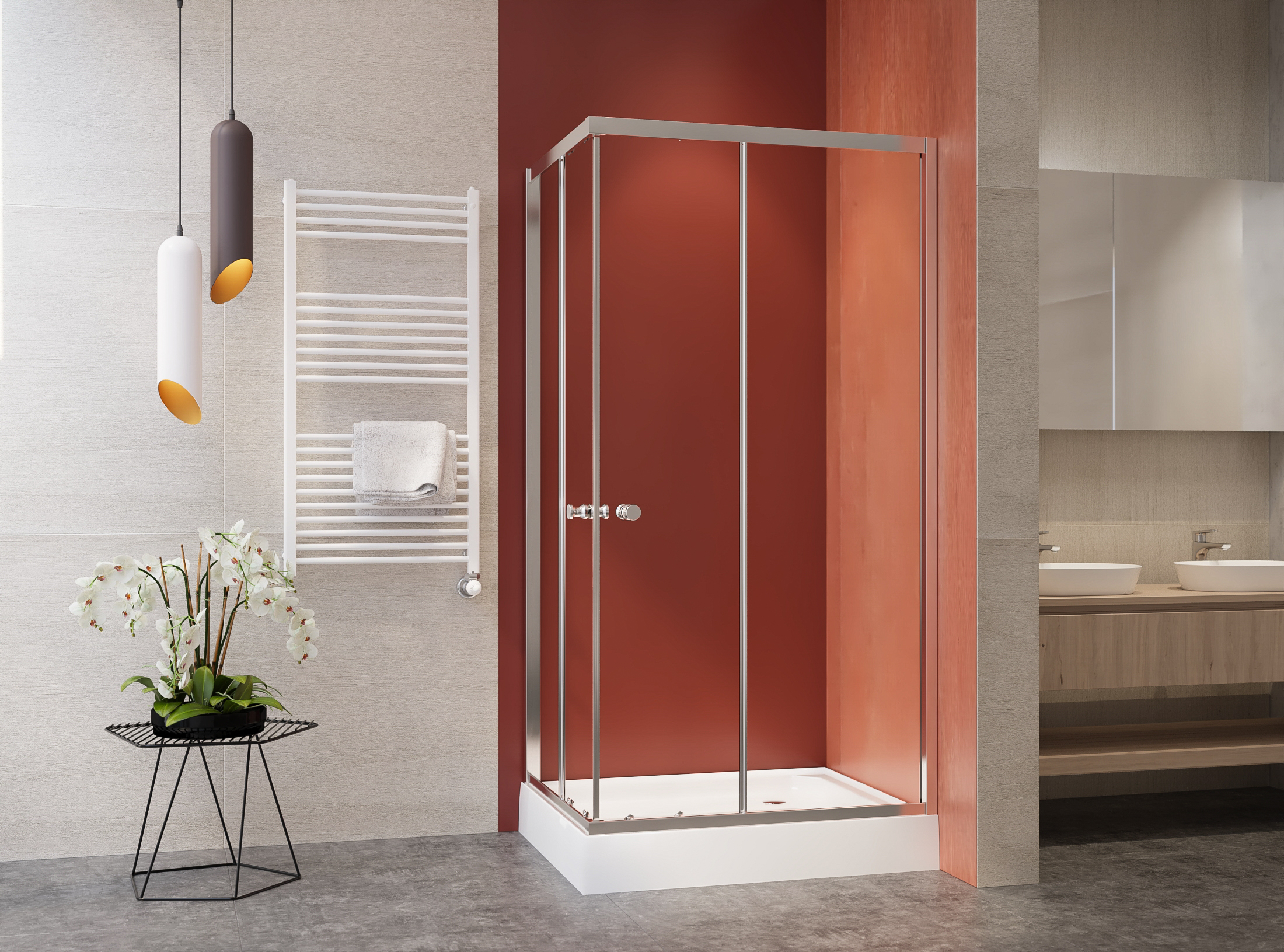 Szögeletes zuhanykabin 100x80x185 cm (beépítési méret:97-99 x 77-79 cm) 5 mm vastag, víztiszta, edzett biztonsági üvegek és ajtók Polirozott alumínium profilok Mágneses ajtózár. Görgős ajtónyitás. Króm fogantyúk.