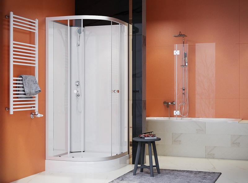 Negyedköríves zuhanykabin tálcával 80x80x200 cm Üvegszál erősítéses, acél merevítésű, fehér színű, alacsony, akril zuhanytálca, állítható fém lábakkal. Matt króm ívek és profilok. 4mm vastag, víztiszta biztonsági üvegek és ajtók. Fehér üveg hátfalak. Matt króm funkciós panel. Kézi zuhany. Kerámia betétes keverőszelep. Mágneses ajtózár. Görgős ajtónyitás. Leeresztő szelep.