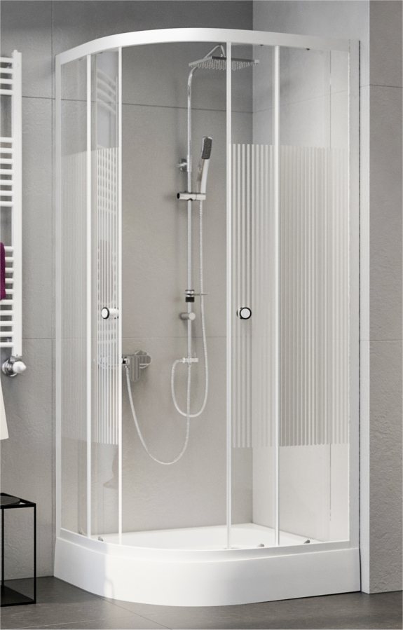 Negyedköríves zuhanykabin tálcával 80x80x200cm Üvegszál erősítéses, acél merevítésű, fehér színű, alacsony, akril zuhanytálca, állítható fém lábakkal. 5 mm vastag, csíkos biztonsági üvegek és ajtók. Fehér aluminium ívek és profilok. Mágneses ajtózár. Görgős ajtónyitás. Fehér fogantyúk Leeresztő szelep.