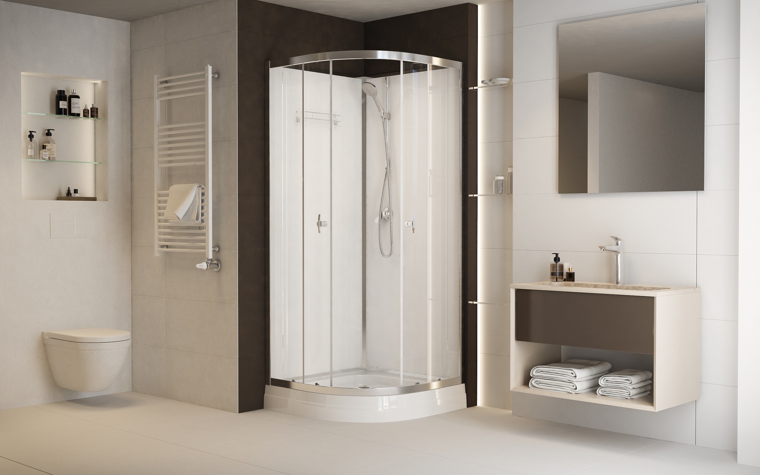 Negyedköríves zuhanykabin tálcával 90x90x200cm Üvegszál erősítéses, acél merevítésű, fehér színű, alacsony, akril zuhanytálca, állítható fém lábakkal. Polírozott ívek és profilok. Víztiszta biztonsági üvegek és ajtók. Fehér üveg hátfalak. Állítható zuhanytartó rúd Kézi zuhany. Piperepolc. Kerámia betétes keverőszelep. Mágneses ajtózár. Görgős ajtónyitás. Leeresztő szelep.