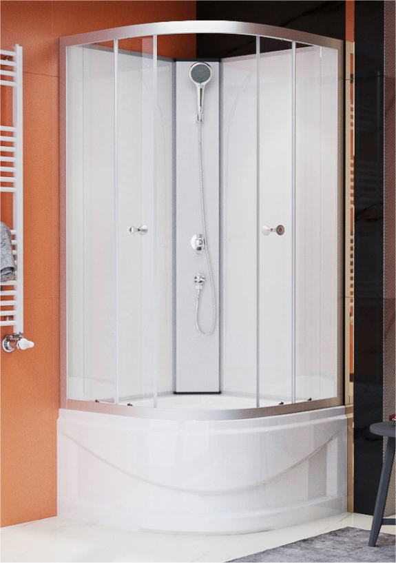 Negyedköríves zuhanykabin tálcával 90x90x200cm Tálca magasság: kb. 38cm Tálca mélység: kb. 27cm Üvegszál erősítéses, acél merevítésű, fehér színű, mély akril zuhanytálca, állítható fém lábakkal. Matt króm ívek és profilok. 4mm vastag, víztiszta biztonsági üvegek és ajtók.. Fehér üveg hátfalak Matt króm funkciós panel. Kézi zuhany. Kerámia betétes keverőszelep. Mágneses ajtózár. Görgős ajtónyitás. Leeresztő szelep.