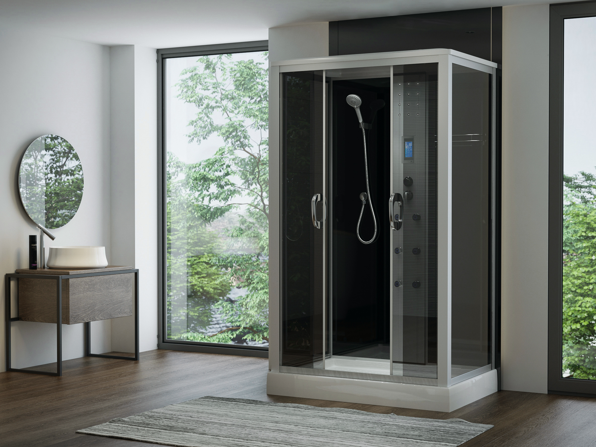 Szögletes hidromasszázs zuhanykabin elektronikával 120x80x222 cm Üvegszál erősítéses, acél merevítésű, fehér színű, alacsony, akril zuhanytálca, állítható fém lábakkal. Matt króm alumínium profilok. 5 mm vastag, sötétített biztonsági üvegek és ajtók. Fekete üveg hátfalak. Matt króm funkciós panel. 6 db hidromasszázs fúvóka. Érintőképernyős kijelző. Rádió. Felső világítás. LED háttérvilágítás. Ventilátor. Kézi zuhany. Felső esőztető zuhany. Kerámia betétes keverőszelep és funkcióváltó. Piperepolc. Mágneses ajtózár. Görgős ajtónyitás. Leeresztő szelep.