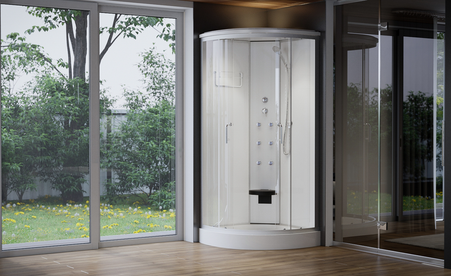 Negyedkörívés hidromasszázs zuhanykabin 90x90x222cm Hagyományos alakú (R550) üvegszál erősítéses, acél merevítésű, fehér színű, alacsony, akril zuhanytálca, állítható fém lábakkal. Matt króm alumíniumívek és profilok. 5 mm víztiszta biztonsági üvegek és ajtók. Fehér színű üveg hátfalak. Mattkróm funkciós panel. 6 db hidromasszázs fúvóka. Kézi zuhany. Felső esőztető zuhany. Felhajtható ülőke. Kerámia betétes keverőszelep és funkció váltó. Piperepolc. Mágneses ajtózár. Görgős ajtónyitás. Leeresztő szelep.