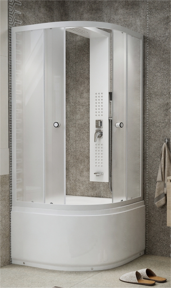 Negyedköríves zuhanykabin tálcával 90x90x200cm Tálca magasság: 48cm Tálca mélység: 39cm Üvegszál erősítéses, acél merevítésű mély akril zuhanytálca, állítható fém lábakkal, beépített ülőkével. Fehér profilok. 5mm vastag katedrál biztonsági üveg. Mágneses ajtózár. Görgős ajtónyitás. Leresztő szelep. A mintázott üveg részben átlátható, így biztosítja az intim teret a zuhanyzás során anélkül, hogy teljesen elzárna.