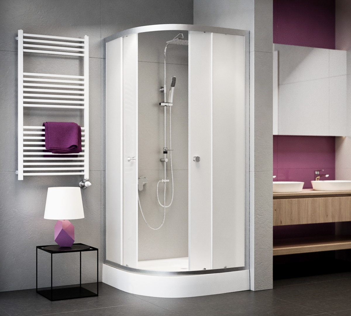 Negyedköríves zuhanykabin 90x90x185cm 5 mm vastag, katedrál biztonsági üvegek és ajtók. Polírozott ívek és profilok. Mágneses ajtózár. Görgős ajtónyitás. Krómozott fogantyúk. A mintázott üveg részben átlátható, így biztosítja az intim teret a zuhanyzás során anélkül, hogy teljesen elzárna.