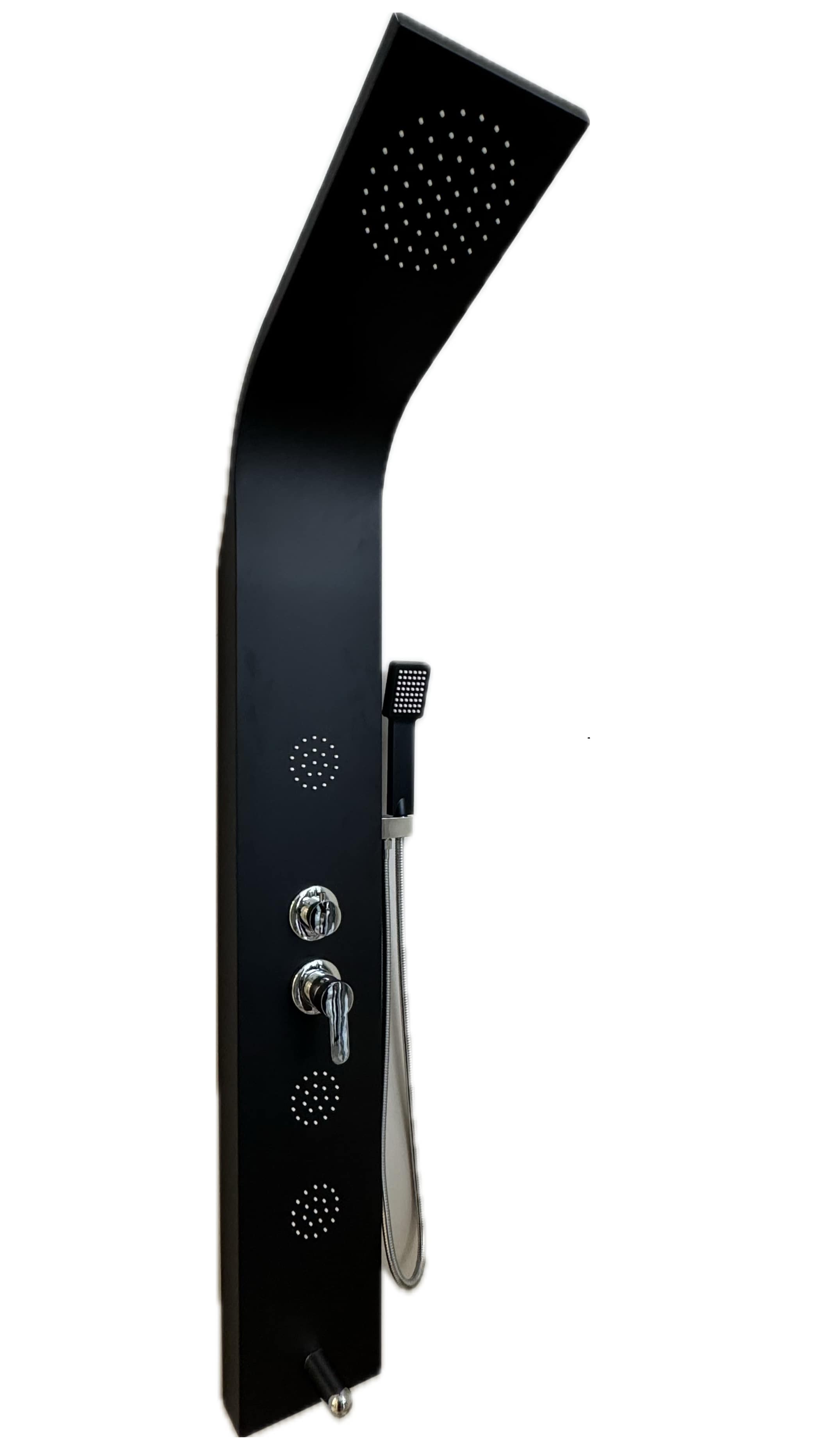 Hidromasszázs zuhanypanel 150x22 cm Fekete-króm színű alumínium zuhanypanel 3 db kör alakú fix hidromasszázs fúvóka Kerámia betétes keverőszelep és funkcióváltó Kézi zuhany Felső fix esőztető zuhany Kádtöltő funkció